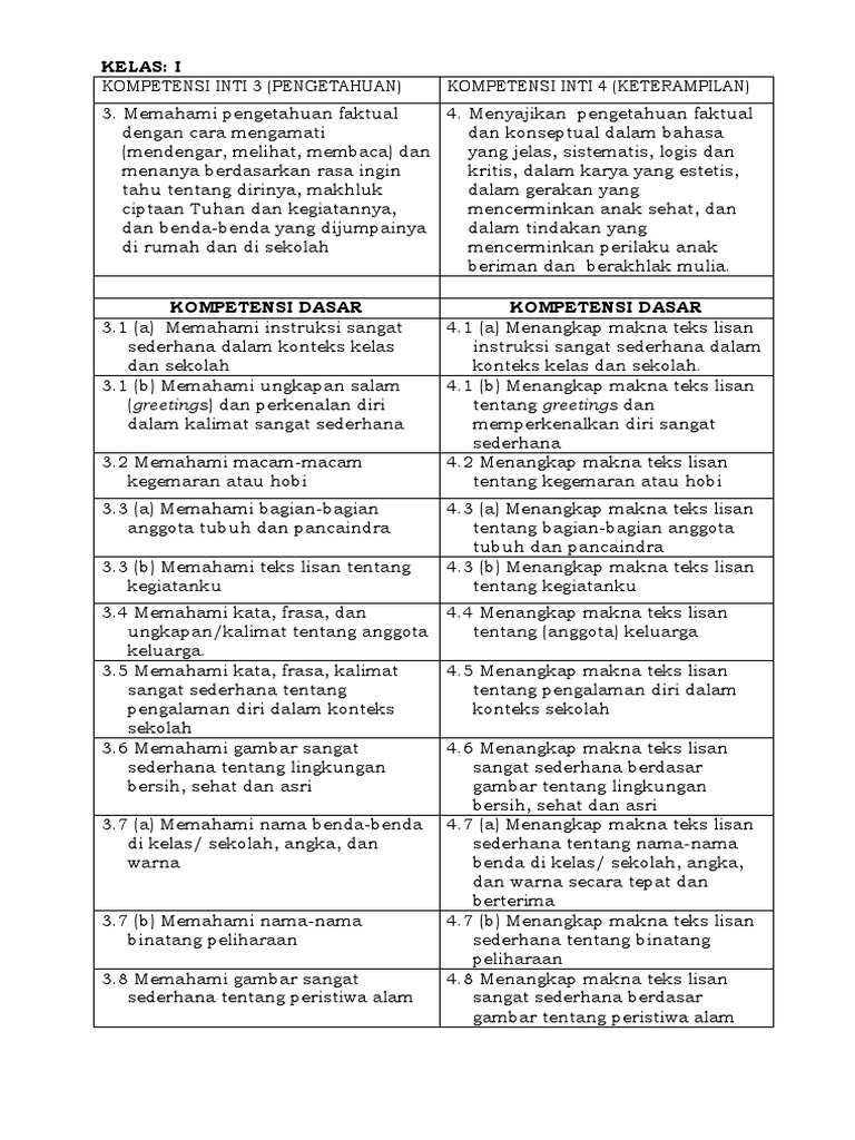 Download lengkap kompetensi inti dan kompetensi dasar bahasa inggris sd/mi kelas 1 s.d.