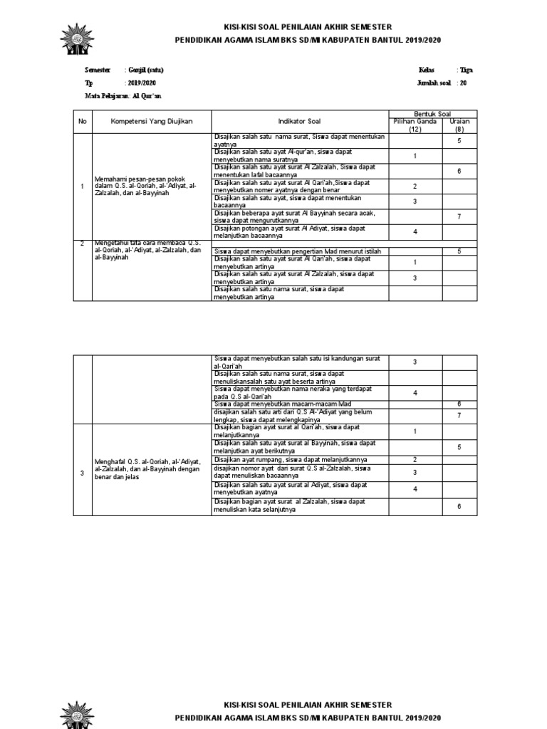 Disajikan potongan ayat yang bergaris bawah dari surat terkait yang ada di bab 1,2 dan 7, peserta didik diminta untuk. Mar 04, 2021 · soal mid kelas 8 revisi. Kisi uas pai kelas xii semester 2 tahun 2019. Kisi kisi ukk uas pai kelas 5 semester 2 genapdapatkan kisi kisi penulisan soal ulangan kenaikan kelas tahun ajaran 2016 2017 sesuai dengan kurikulum ktsp khusus untuk kelas 5 sd mata pelajaran pendidikan agama islam. Kumpulan materi pembelajaran pendidikan agama islam smk.