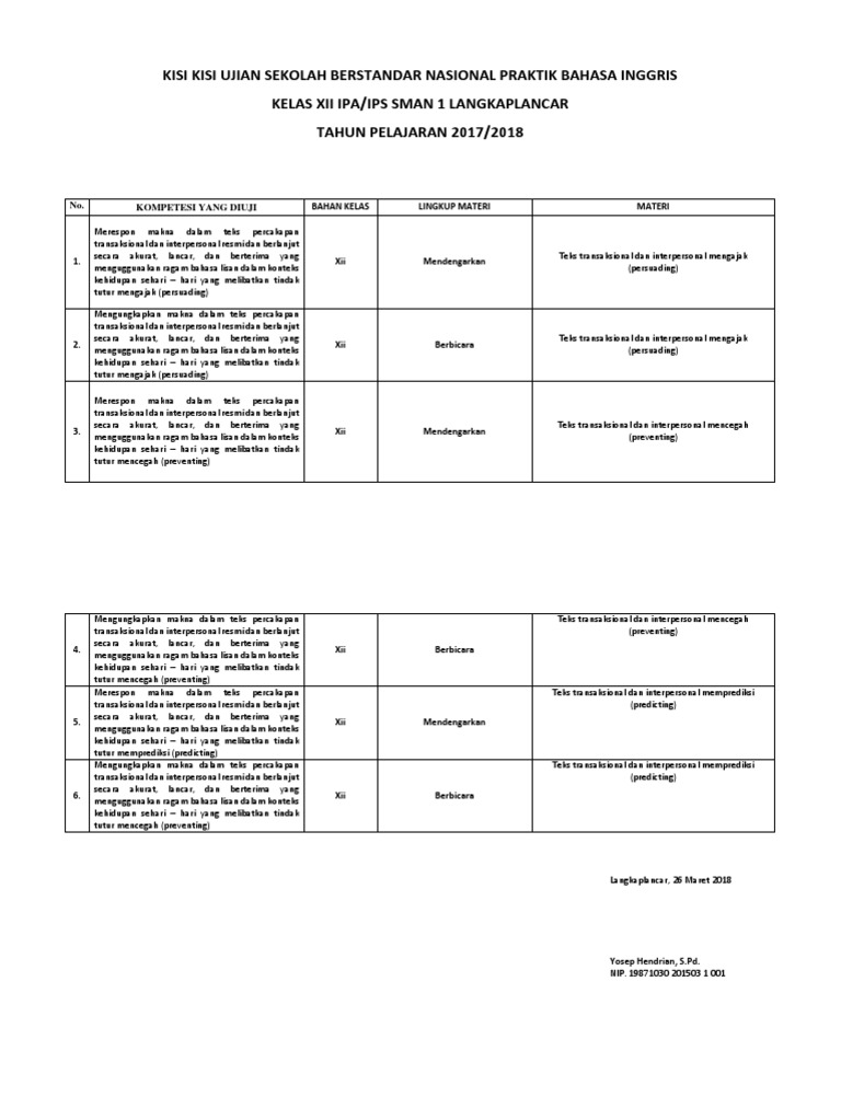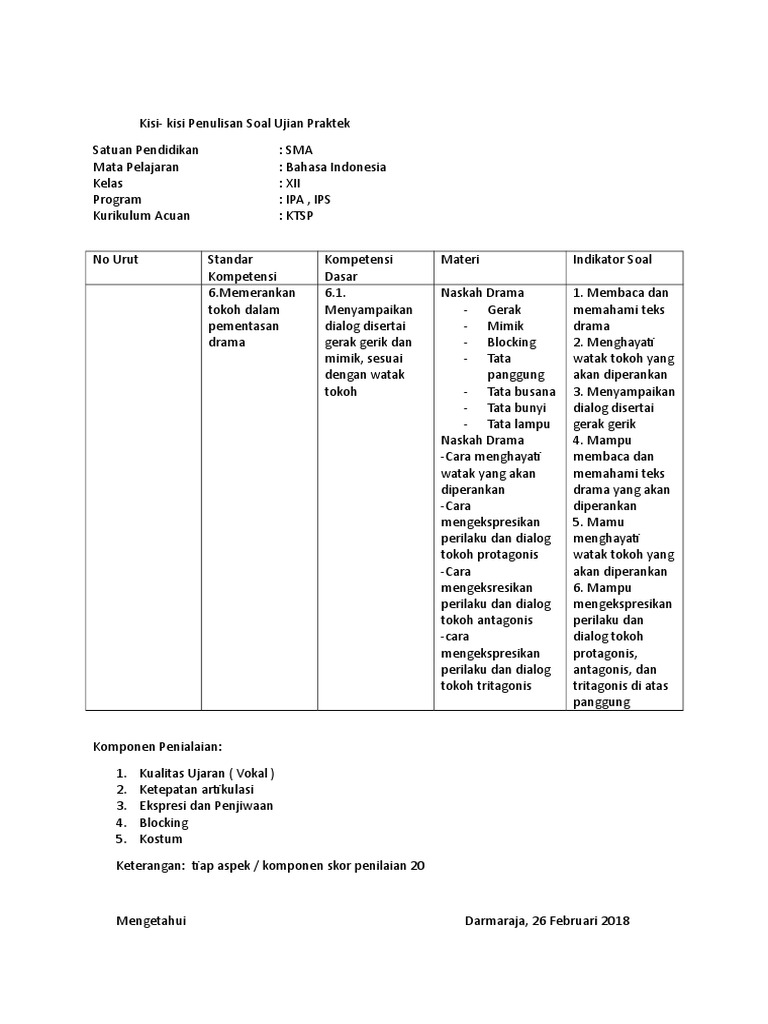 Kisi Kisi Ujian Praktik Bahasa Indonesia Sma 2018 Cara Golden from imgv2-1-f.scribdassets.com Disajikan sebuah kalimat, siswa disuruh menentukan yang termasuk bagian nomina. Di sekolah dasar, ujian ini biasanya dilaksanakan. Speaking standar kompetensi mengungkapkan makna dalam teks perc. Ujian praktek bahasa indonesia kelas xii 1. Kompetensi/ sub kompetensi indikator kelas sem no. Disajikan sebuah gambar dan diperdengarkan empat buah pernyataan, siswa dapat menentukan pernyataan yang tepat untuk menyatakan. Disajikan lima macam gambar, grafik, atau tabel, siswa dapat. 45 butir soal no kompetensi dasar indikator no soal bentuk.